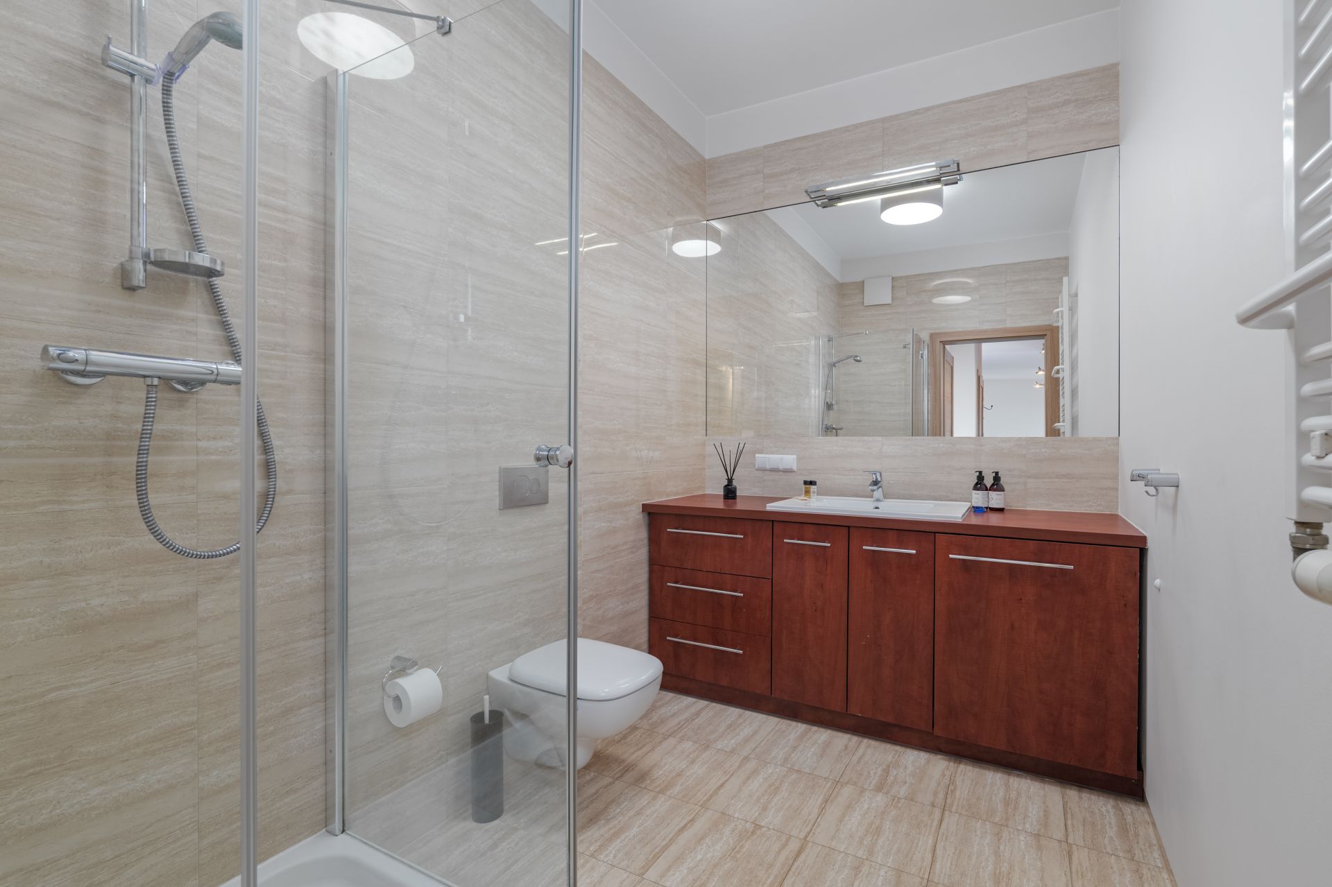 Łazienka: przestronny prysznic, pralka, umywalka, wc