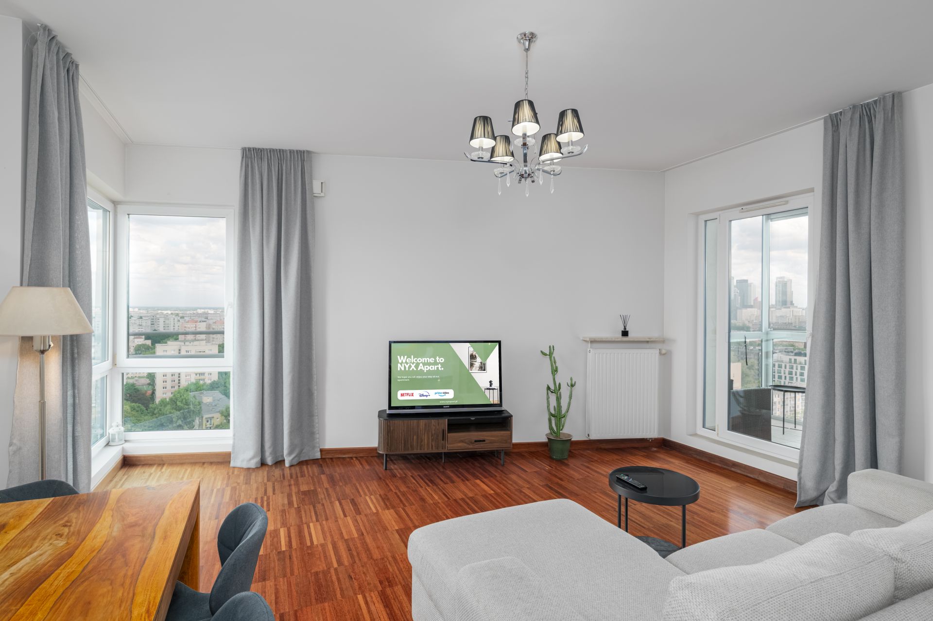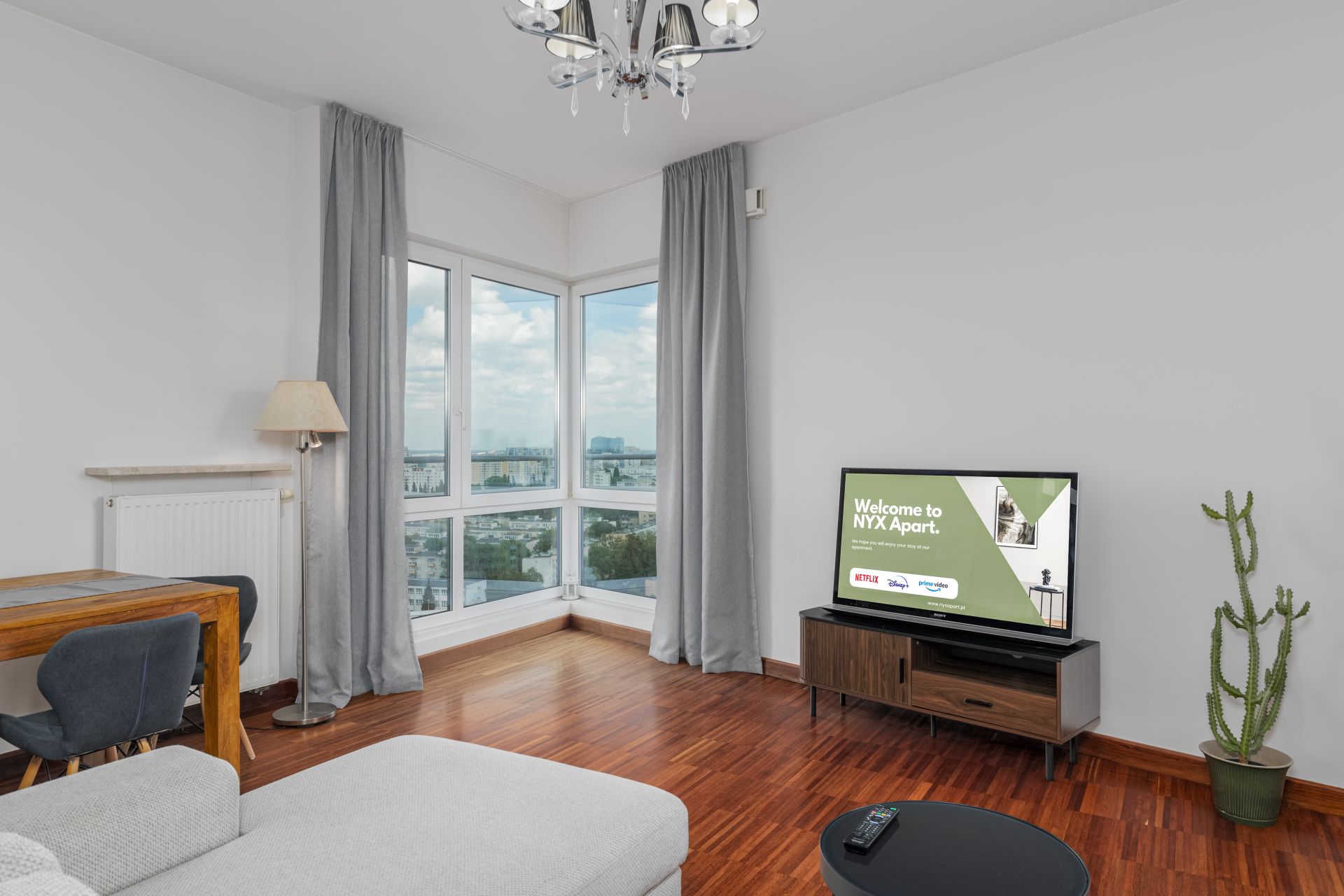 Salon: rozkładana kanapa, stół, stolik, telewizor