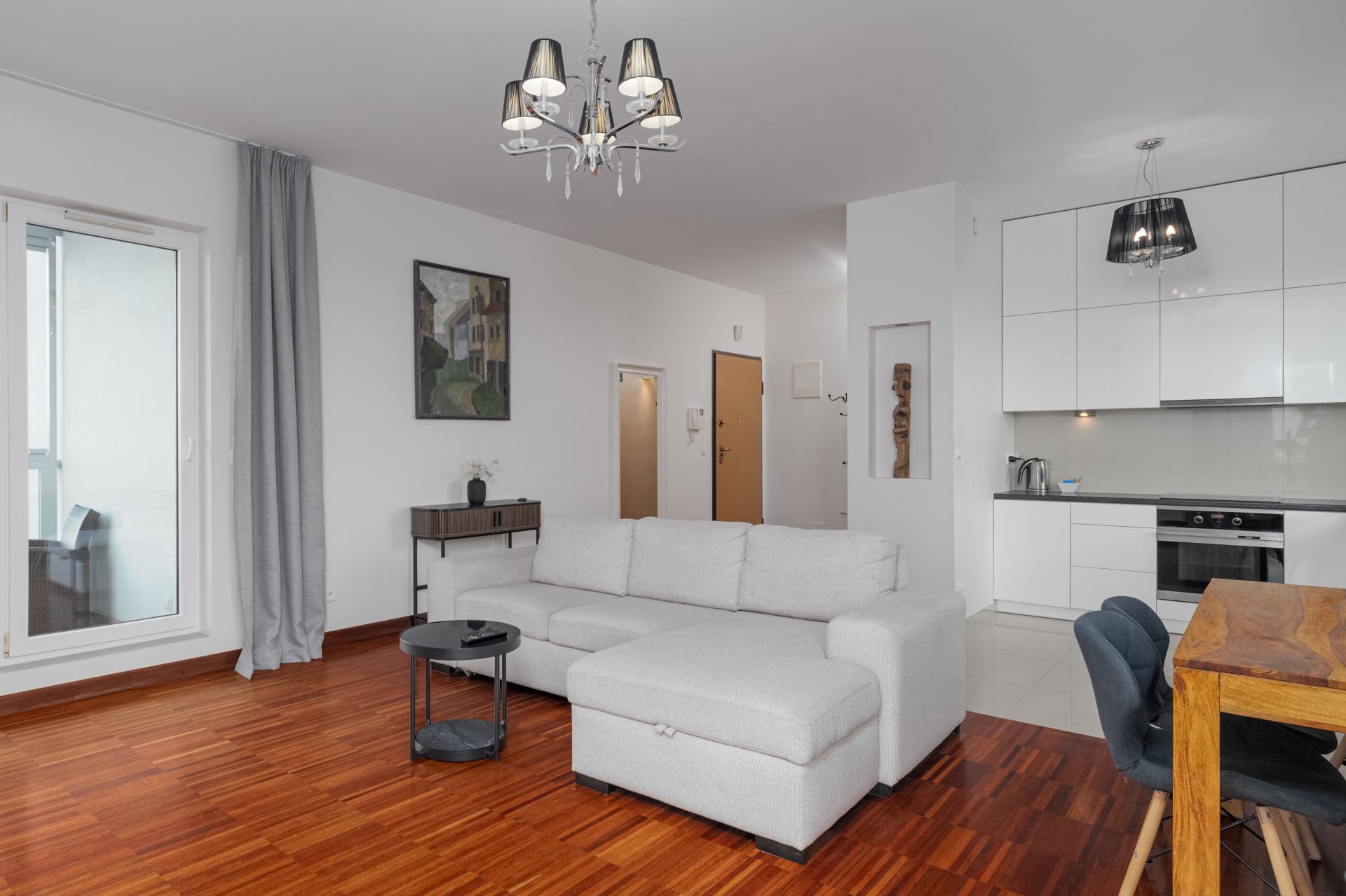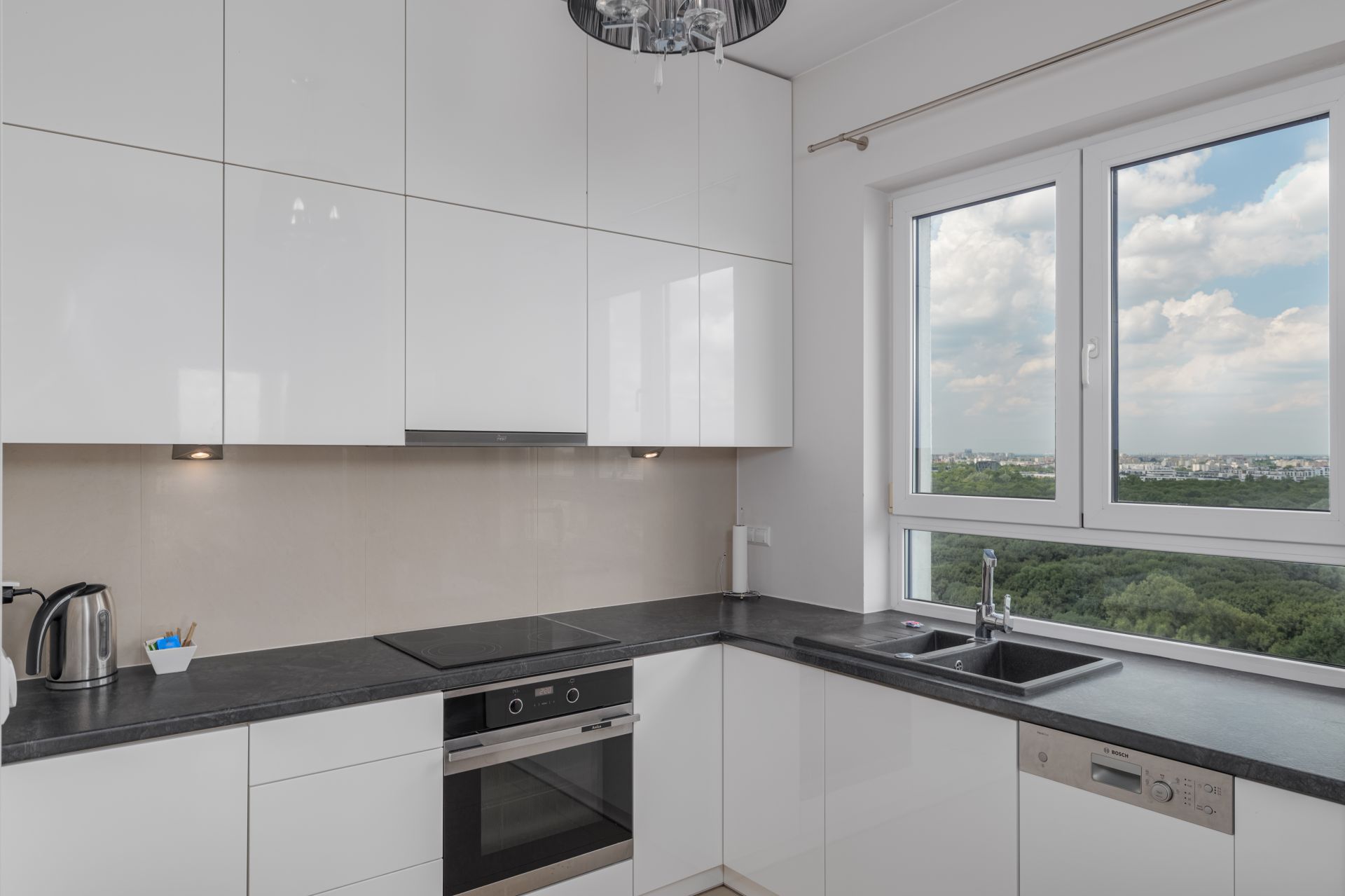 Kuchnia: lodówka, zmywarka, piekarnik, płyta indukcyjna, czajnik